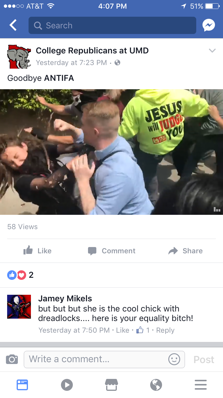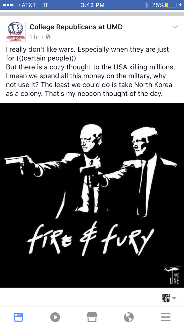 “After the recent postings and now deleted posts on our College Republican Facebook page I would like to issue a personal apology to my fellow students at UMD,” Lundeen said. “Please know from the bottom of my heart that I would never condone this kind of behavior and I condemn white supremacists, violence, hate, hate groups and racism . . . The last thing that I can hope for is that the person that wrote these posts can step up and be held accountable for their actions.”