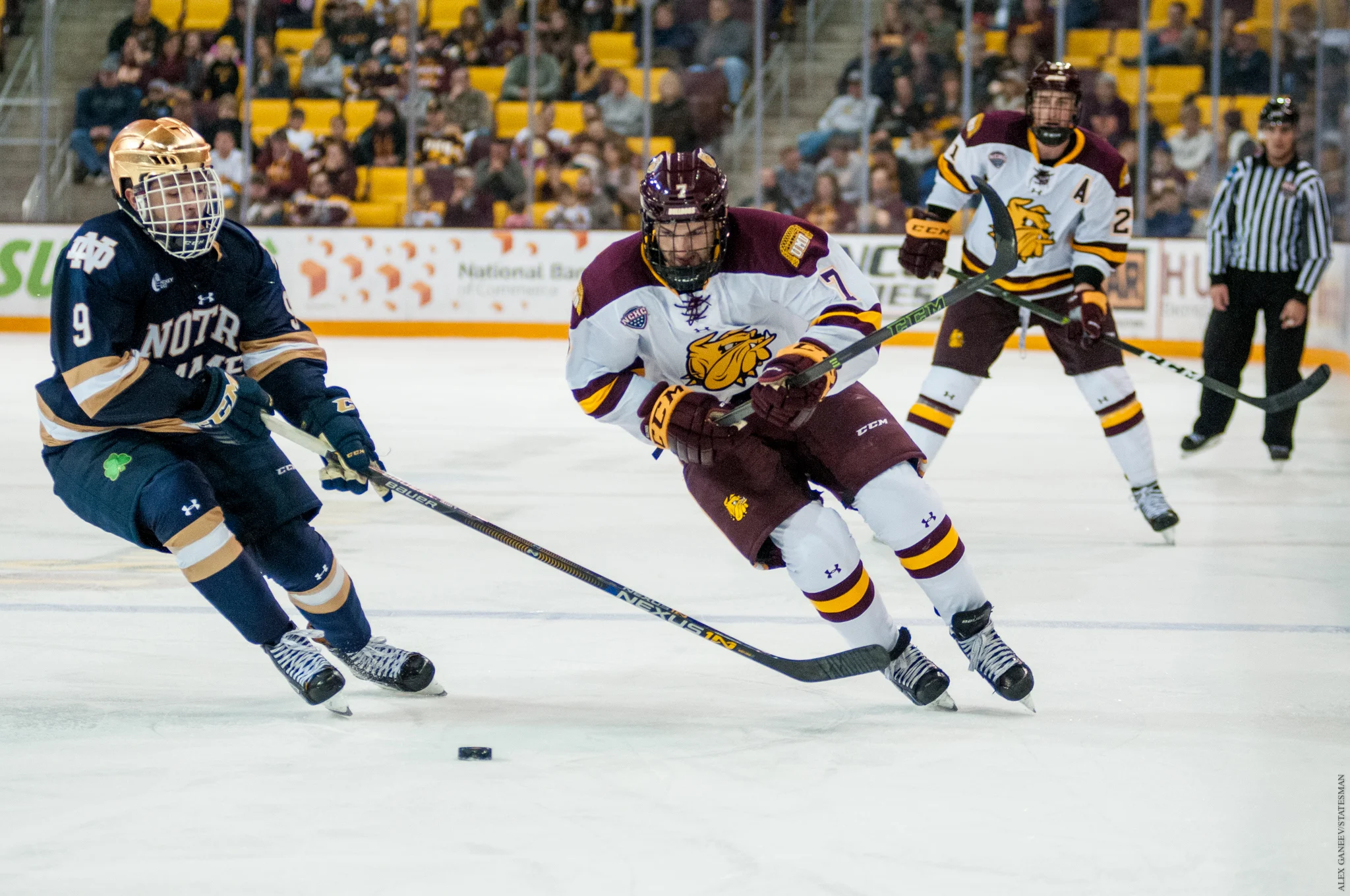 The Bulldogs could not hold the lead, however, as Notre Dame scored late in the second to tie the game headed into the third. A pair of third period goals by Notre Dame’s Jordan Gross and Dylan Malmquist all but sealed the Bulldog’s fate and they would fall 3-1.